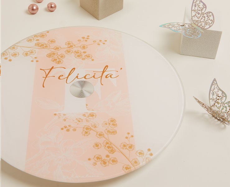 Un vassoio elegante e raffinato, decorato con il tema "Felicità", perfetto per aggiungere un tocco di classe alla tua tavola. Realizzato in vetro, questo vassoio girevole è ideale per servire antipasti o dessert con stile e funzionalità.