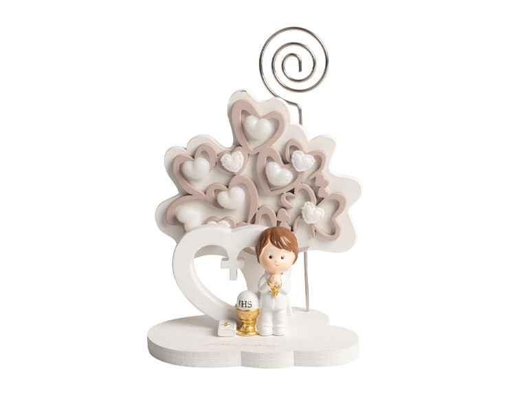 Un dolcissimo Albero della Vita in resina, arricchito da un bimbo in tenuta da Comunione e dettagli simbolici come il calice dorato con la scritta IHS. Questo articolo è perfetto per celebrare la Prima Comunione, rappresentando un dono simbolico e duraturo.