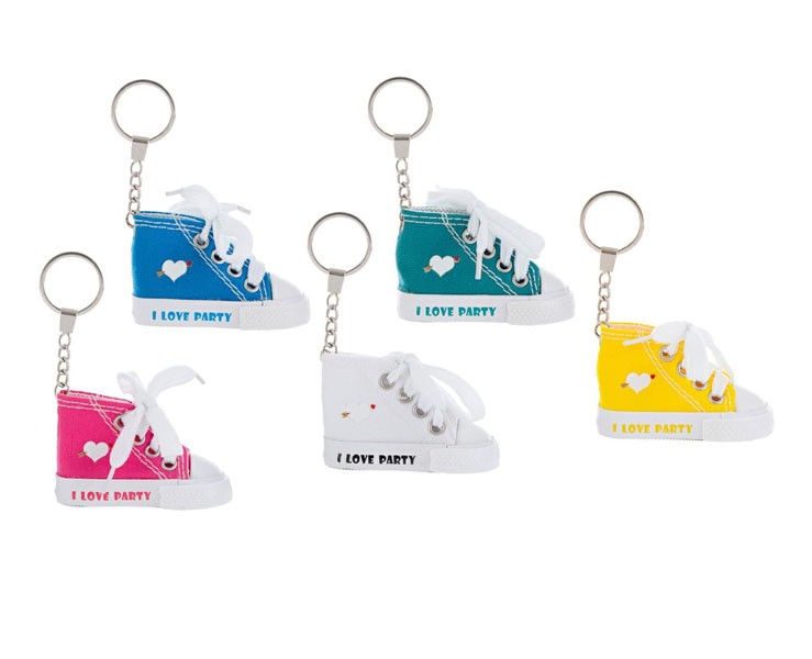 Aggiungi un tocco di stile alle tue chiavi con questi originali portachiavi a forma di sneaker! Realizzati in tela, sono disponibili in cinque colori vivaci assortiti (rosa, blu, verde, giallo, bianco) con dettagli curati e la scritta "I Love Party" sulla suola. Perfetti come gadget per feste, regali originali o decorazioni trendy.