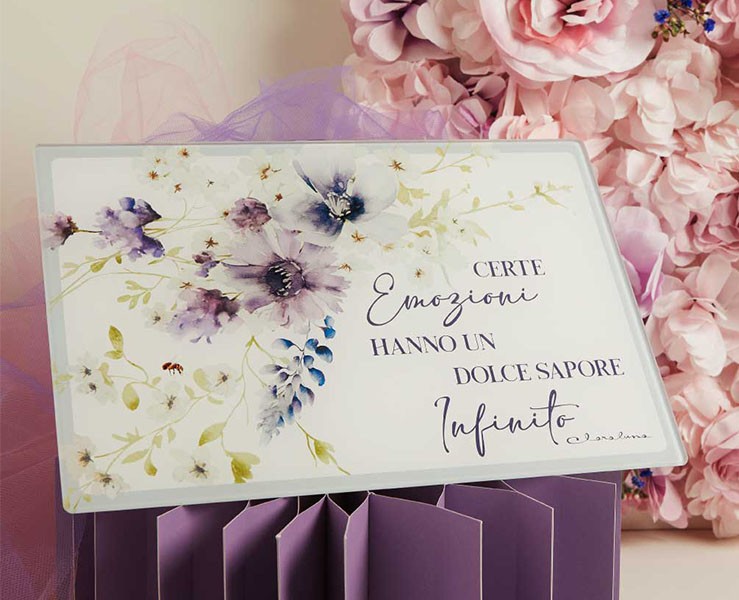 Il design è splendidamente impreziosito da un delicato decoro floreale acquerellato sui toni del lilla, viola e blu pallido, e dalla frase evocativa "CERTE EMOZIONI HANNO UN DOLCE SAPORE INFINITO". Questo lo rende un pezzo unico, perfetto anche come bomboniera o regalo.