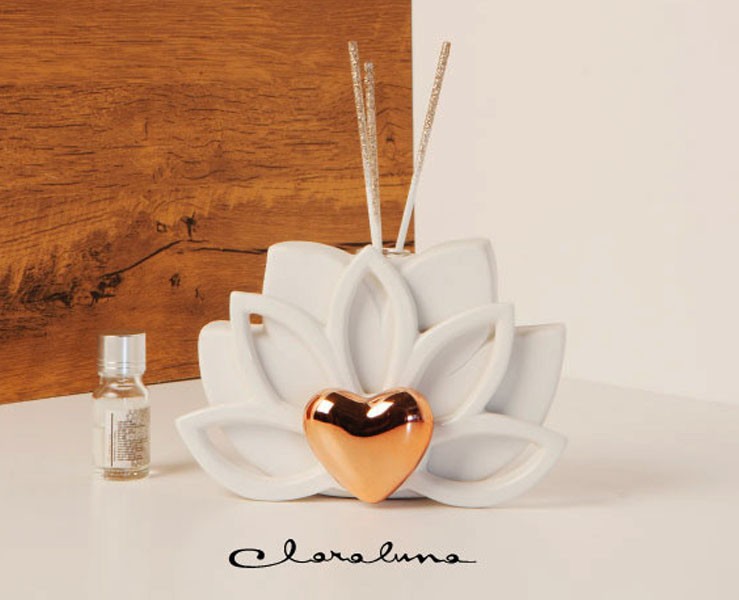 Bomboniera Matrimonio Claraluna fiore bianco cuore oro profumatore con kit essenza