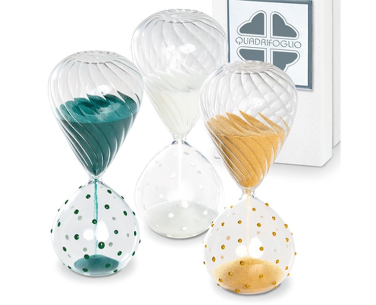 Eccellenza Artigianale e Design: Realizzata in cristallo di alta qualità, ogni clessidra si distingue per una meticolosa lavorazione del vetro. La parte superiore presenta un'elegante texture a spirale, mentre la base è decorata con delicati punti in rilievo che richiamano il colore della sabbia interna. L'assortimento in tre varianti cromatiche (oro, bianco perla e verde smeraldo) permette di offrire agli ospiti un dono variegato ma coerente nello stile, capace di adattarsi a ogni gusto e ambiente. Con la sua altezza di 25 cm, è perfetta per impreziosire scrivanie, mensole o angoli dedicati ai ricordi.