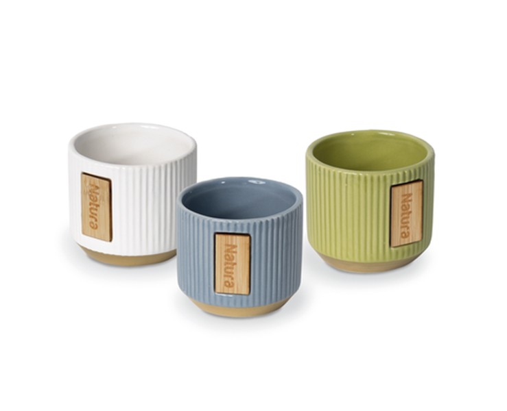 Eccellenza Artigianale e Design: Il portapiante è realizzato in ceramica di alta qualità con una finitura opaca e una sofisticata texture a righe verticali (plissettata) che dona dinamismo all'oggetto. Il design è impreziosito da una placchetta in legno naturale con l'incisione "Natura", che sottolinea lo stile eco-chic della collezione. Disponibile in un assortimento di tre tonalità polverose e contemporanee (Bianco, Carta da Zucchero e Verde Salvia), ogni pezzo misura 7x6 cm, dimensione ideale per ospitare piccole piante grasse o piantine aromatiche.