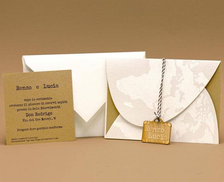 Partecipazione di nozze tema viaggio, composta da un esterno in carta perlata avorio e incisione laser di un planisfero, interno in carta materica kraft su cui è stampato il testo della partecipazione, all'esterno è presente un tag in legno forma valigetta con nomi degli sposi incisi a laser. Invito e busta abbinata.