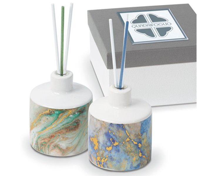 Eccellenza Artigianale e Design: Il diffusore presenta un corpo in ceramica di alta qualità con una finitura che evoca le venature naturali del marmo. È disponibile in due varianti cromatiche assortite: una nelle tonalità del verde giada e terra, l'altra nelle sfumature del blu notte e zaffiro. Entrambe le versioni sono impreziosite da colate di colore bronzo/oro che donano un riflesso prezioso e unico. Il set include bastoncini diffusori coordinati, pronti a diffondere la tua fragranza preferita in ogni ambiente. Con le sue dimensioni di 7x8 cm, si inserisce con eleganza in ogni stile di arredamento, dal classico al contemporaneo.