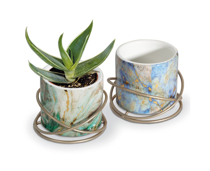 Eccellenza Artigianale e Design: I portapiante sono caratterizzati da una pregiata finitura che richiama la bellezza organica del marmo. Sono disponibili in due varianti cromatiche assortite: una nelle tonalità del verde smeraldo e terra, l'altra nelle sfumature del blu cobalto e cielo. Entrambi i modelli sono impreziositi da venature bronzo/oro che donano brillantezza e sono abbracciati da un moderno supporto in metallo satinato color bronzo. Con le loro dimensioni di 8x7 cm, sono perfetti per ospitare piccole piante grasse o succulente, diventando un ricordo vivo e duraturo.