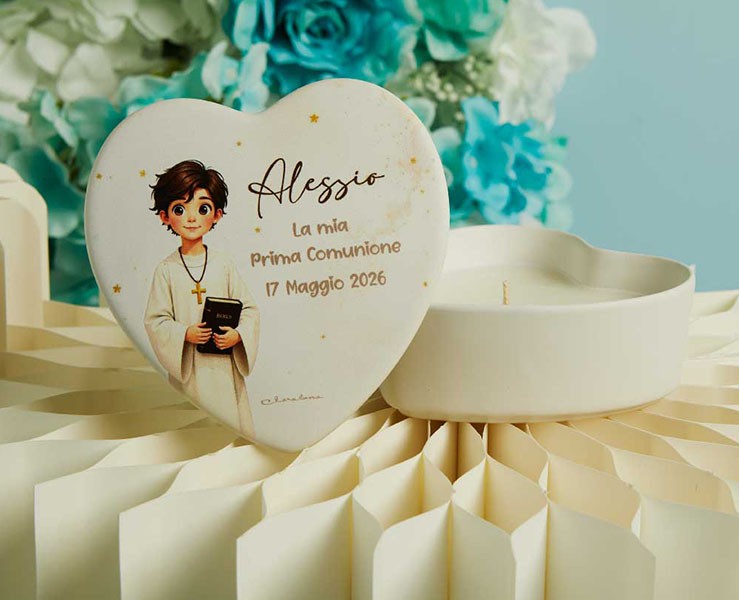 La Scatola Cuore ragazzo Personalizzabile con candela profumata personalizzabile interna di Claraluna è la bomboniera ideale per celebrare i momenti più importanti nella vita di una bambina, aggiungendo un tocco di dolcezza e personalizzazione.