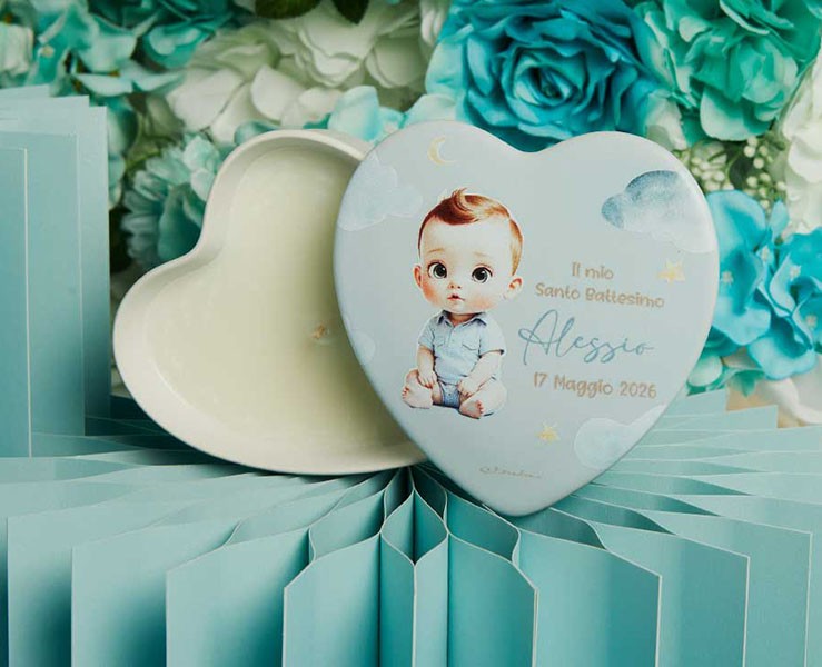 La Scatola Cuore Bimbo Personalizzabile con candela di Claraluna è la bomboniera ideale per celebrare la nascita o la cerimonia di un maschietto, offrendo un ricordo tenero e duraturo.