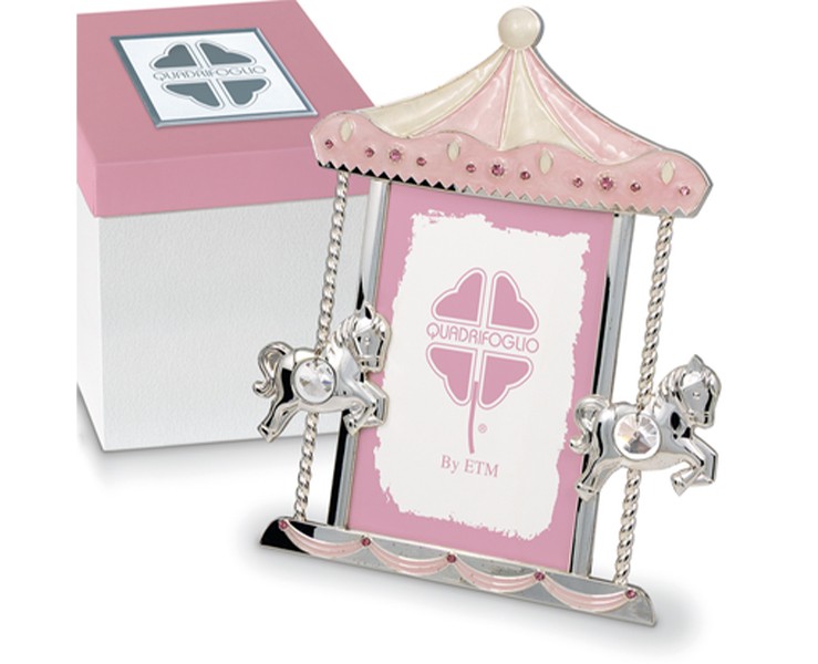 Eccellenza Artigianale e Design: Il portafoto si distingue per il design incantevole che richiama le antiche giostre a cavalli. La struttura argentata incornicia perfettamente lo spazio per la foto, sormontata da un sontuoso tettuccio smaltato in Rosa e panna. I dettagli sono curati nei minimi particolari: dai cavallini rampanti laterali con grandi punti luce incastonati, alla fila di strass rosa che impreziosiscono sia la corona superiore che la base decorata a onde. Con le sue dimensioni generose di 19x24 cm, diventa il protagonista assoluto di ogni ambiente.