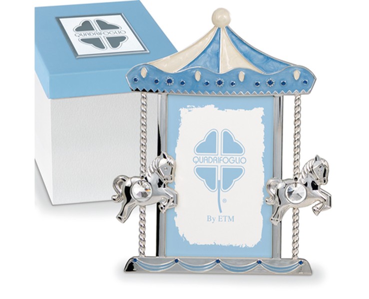 Eccellenza Artigianale e Design: Il portafoto si distingue per il design incantevole che richiama le antiche giostre a cavalli. La struttura argentata incornicia perfettamente lo spazio per la foto, sormontata da un sontuoso tettuccio smaltato in azzurro cielo e panna. I dettagli sono curati nei minimi particolari: dai cavallini rampanti laterali con grandi punti luce incastonati, alla fila di strass blu che impreziosiscono sia la corona superiore che la base decorata a onde. Con le sue dimensioni generose di 19x24 cm, diventa il protagonista assoluto di ogni ambiente.