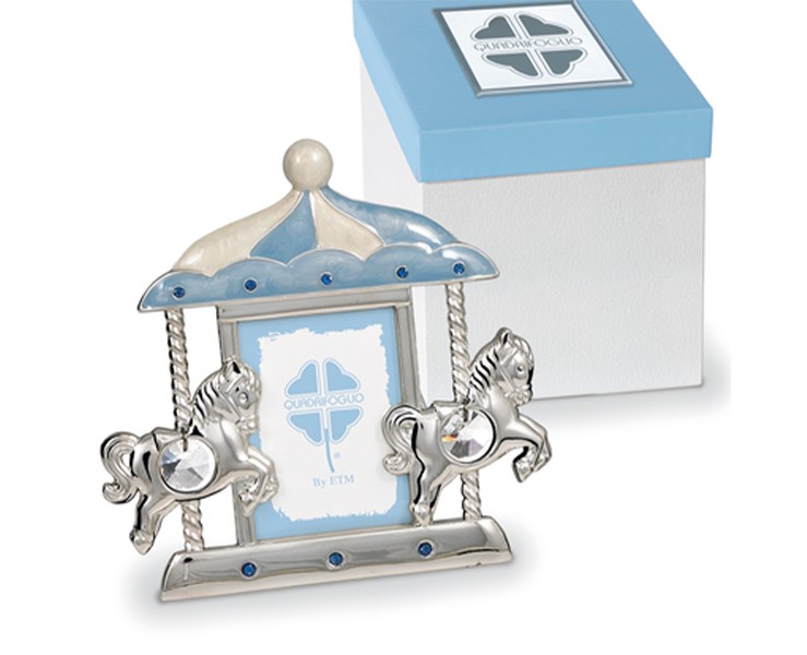 Eccellenza Artigianale e Design: Il portafoto riproduce l'incanto di una giostra classica (carosello) con una brillante finitura argento. La struttura è arricchita da due graziosi cavallini laterali impreziositi da grandi punti luce (strass) che catturano la luminosità. Il tettuccio è decorato con smalto azzurro e panna, rifinito con piccoli strass blu che richiamano la base, creando un equilibrio cromatico perfetto. Con le sue dimensioni di 14x14 cm, è un oggetto d'arredo di grande impatto visivo, ideale per la cameretta del tuo bambino.