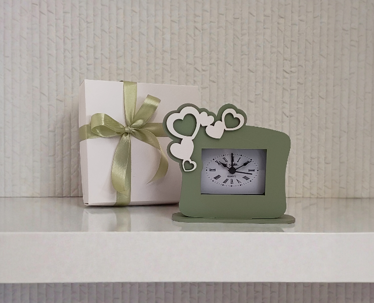 Bomboniera Matrimonio Orologio da Tavolo con Cuori Intagliati in Legno Verde Salvia