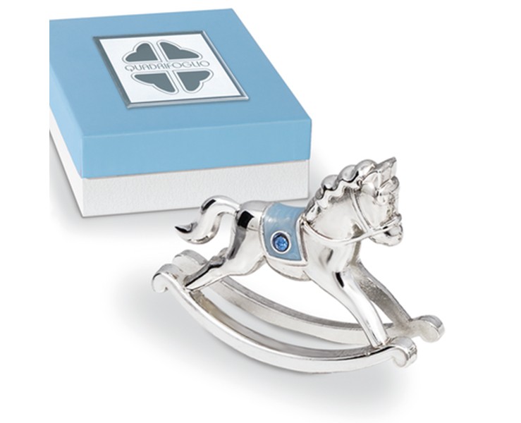 Bomboniera Solidale Cavallo a Dondolo Argento e Celeste Quadrifoglio per Fondazione ABIO