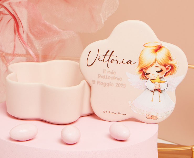 Bomboniera Claraluna scatolina angioletto rosa personalizzabile