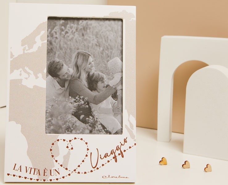 Questo portafoto della collezione Claraluna è perfetto per chi ama viaggiare o vuole celebrare i momenti speciali della propria vita come un viaggio unico. Realizzato in legno e decorato con un disegno del mappamondo e la frase "La vita è un viaggio", rappresenta un pensiero simbolico e originale per conservare ricordi preziosi. Le dimensioni di 15x21 cm lo rendono ideale per esporre foto importanti, rendendolo un perfetto regalo per matrimoni, anniversari, e altre celebrazioni significative.