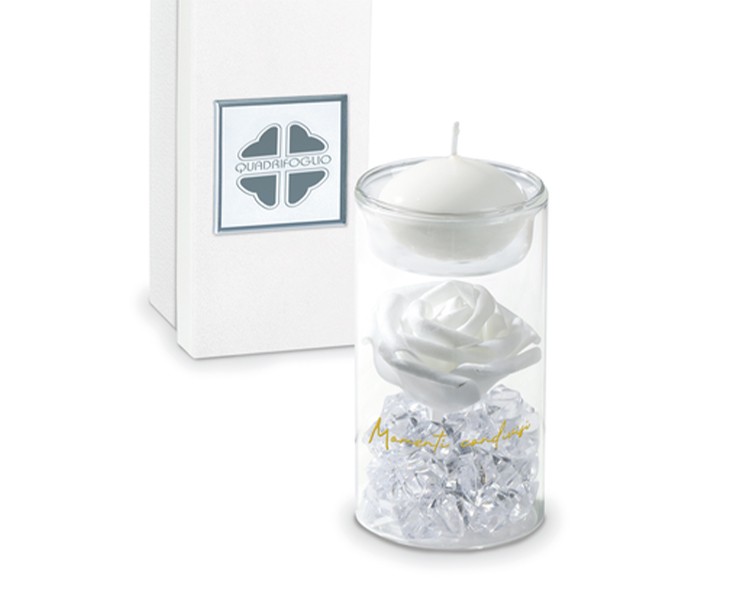 Eccellenza Artigianale e Design: La bomboniera è composta da un cilindro in vetro trasparente di alta qualità che protegge e valorizza il suo contenuto. All'interno, una splendida rosa bianca artigianale poggia su una base di cristalli acrilici sfaccettati che catturano e riflettono la luce con un effetto "platino". Sulla superficie del vetro è incisa in un raffinato color oro la scritta "Momenti condivisi", che trasforma l'oggetto in un ricordo emozionale. La parte superiore è predisposta per accogliere una candela tea-light (inclusa), trasformando la composizione in un suggestivo punto luce. Con le sue dimensioni di 6x11 cm, si adatta perfettamente a ogni stile di arredamento.