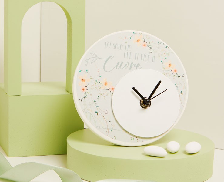 La collezione Claraluna 2025 propone un'elegante bomboniera: l'orologio in legno con decoro floreale verde, dalle dimensioni di 17 x 14,3 x 8 cm. Questo raffinato orologio è perfetto per aggiungere un tocco di classe e funzionalità agli ambienti, rendendolo ideale per matrimoni, comunioni, battesimi, compleanni e anniversari.