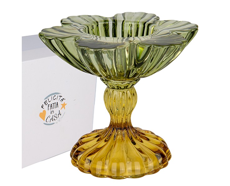 La struttura in vetro presenta una base circolare scanalata color ambra che si snoda in uno stelo sottile, per poi aprirsi in una coppa superiore a forma di fiore. Questa parte superiore, tinta di un elegante verde smeraldo, è caratterizzata da petali ondulati che circondano il vano per la candela, creando un effetto scenografico quando la fiamma è accesa. La lavorazione a coste verticali su tutta la superficie enfatizza i riflessi cromatici e la brillantezza del materiale.
