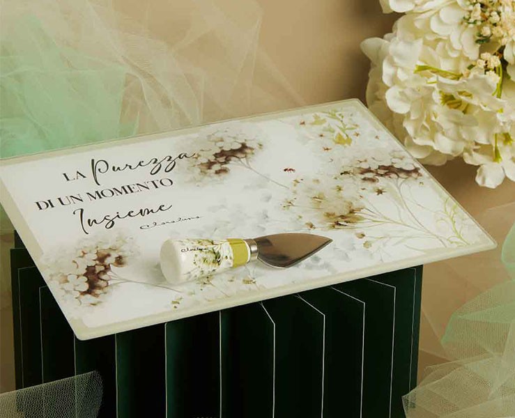 Bomboniera Matrimonio Claraluna 2026 Tagliere in Vetro e Coltellino Decoro Floreale