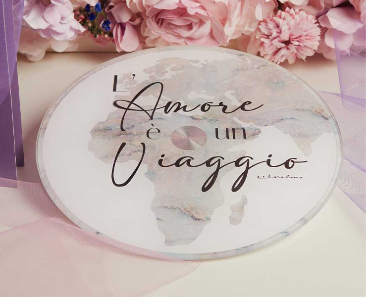 Il design è moderno ed evocativo: presenta una mappa del mondo stilizzata sui toni neutri del bianco, grigio e rosa cipria. Il tutto è impreziosito dalla frase sentimentale "L'Amore è un Viaggio" in un elegante carattere calligrafico nero.