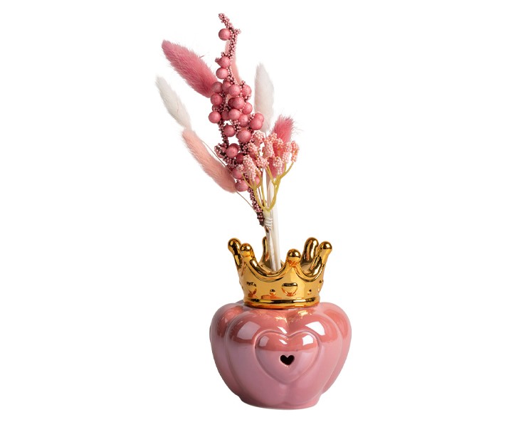 Raffinato profumatore d’ambiente in porcellana rosa con dettagli a forma di cuore e una splendida corona dorata. La base include un LED luminoso per un effetto magico e decorativo. Perfetto per matrimoni, anniversari o come regalo natalizio. Include un’elegante box e un fazzoletto bianco.
