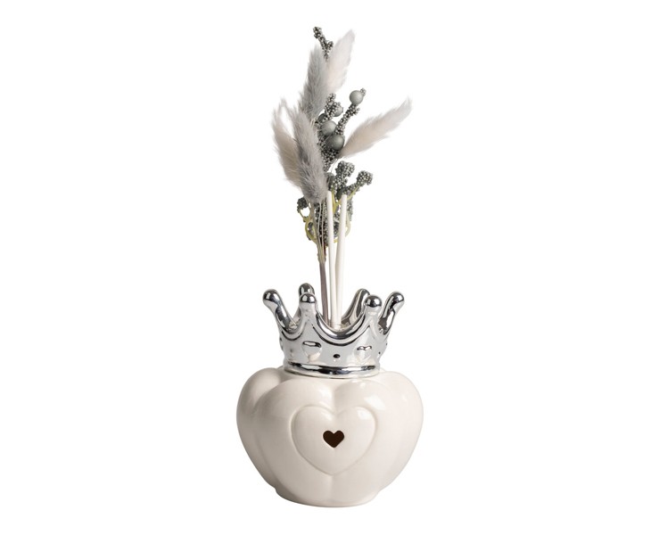 Raffinato profumatore d’ambiente in porcellana bianca con dettagli a forma di cuore e una splendida cargentona argentata. La base include un LED luminoso per un effetto magico e decorativo. Perfetto per matrimoni, anniversari o come regalo natalizio. Include un’elegante box e un fazzoletto bianco.