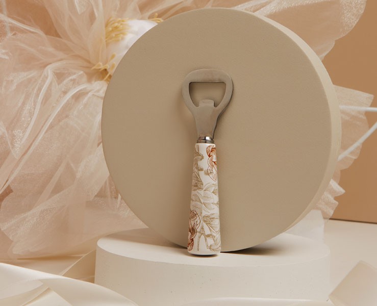 Elegante apribottiglie con manico decorato a tema floreale, perfetto come bomboniera per un matrimonio raffinato. Questo oggetto unisce praticità e design, offrendo agli invitati un ricordo utile e al tempo stesso ricco di stile.
