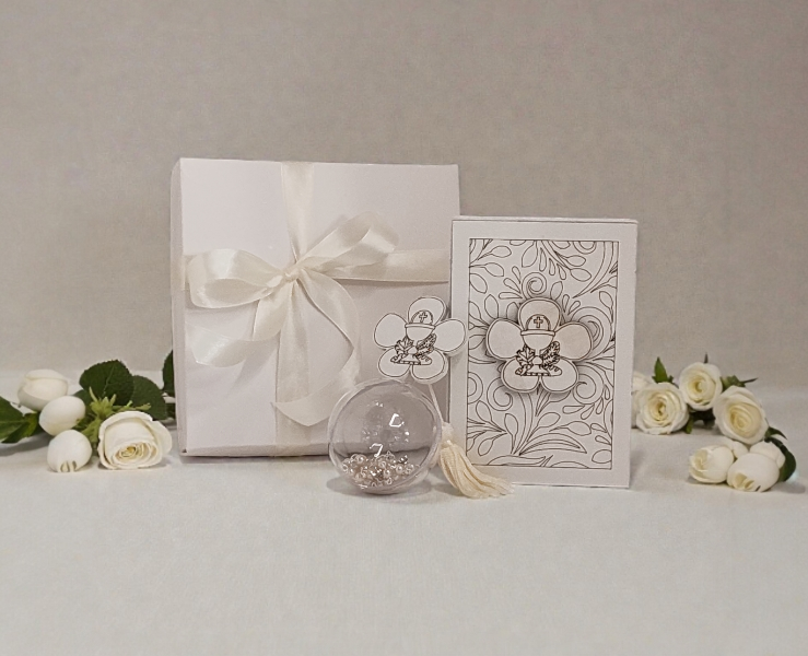 Il set include un volume del Vangelo racchiuso in una custodia o copertina rigida bianca, interamente decorata con un raffinato motivo floreale. Al centro della copertina spicca un'applicazione a forma di quadrifoglio con i simboli eucaristici della Prima Comunione: il Calice e l'Ostia con la Croce, realizzati con una pulita tecnica "line art". Accanto al libro, una sfera in vetro o plexiglass trasparente custodisce un elegante rosario con grani in vetro madreperlato, completato da una nappina in tessuto coordinata.