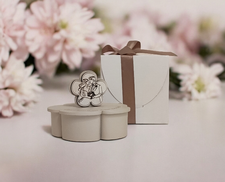 Il design si compone di una base materica in tonalità sabbia/tortora dalla forma a fiore stilizzato, che accoglie una candela a bulbo dalla finitura satinata. Accanto alla candela, spicca l'elemento distintivo della collezione: un quadrifoglio moderno con l'incisione "line art" di due sposi in un tenero abbraccio, un dettaglio che rende l'oggetto unico e immediatamente riconducibile alla gioia del matrimonio.