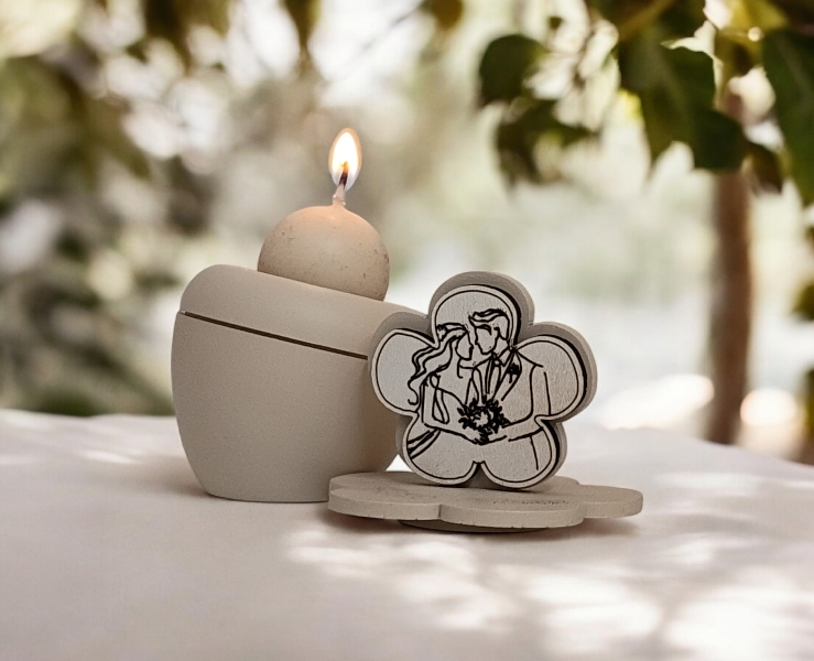 L'oggetto è composto da una base circolare in resina color sabbia che sostiene una candela dalla forma sferica coordinata. Accanto alla fiamma, si erge un decoro a forma di quadrifoglio stilizzato che racchiude l'illustrazione lineare di due sposi nel loro abbraccio nuziale. La pulizia del tratto e la tonalità neutra rendono questa creazione un pezzo d'arredo versatile e senza tempo.