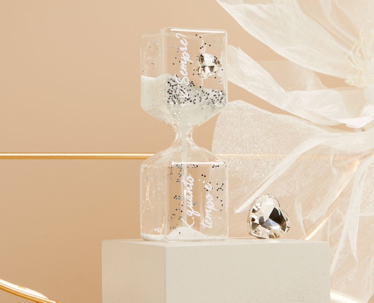 - Design: Clessidra trasparente con sabbia bianca e un piccolo cuore decorativo, arricchita da scritte motivazionali