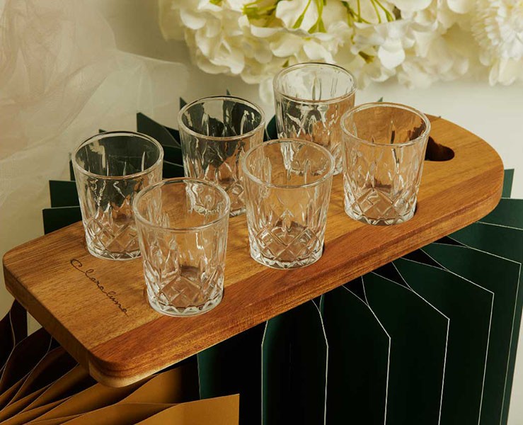 Bomboniera Matrimonio Claraluna 2026 Vassoio in Acacia con 6 Bicchierini