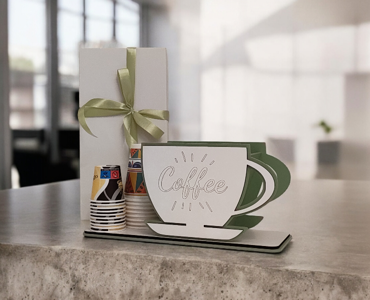 Il design è caratterizzato da una raffinata sovrapposizione di materiali: una base e uno sfondo color verde salvia che mettono in risalto la sagoma frontale di una tazzina bianca. La scritta "Coffee" incisa con cura aggiunge un tocco accogliente e moderno. La struttura è pensata per essere stabile e resistente, mantenendo tutto il necessario a portata di mano.
