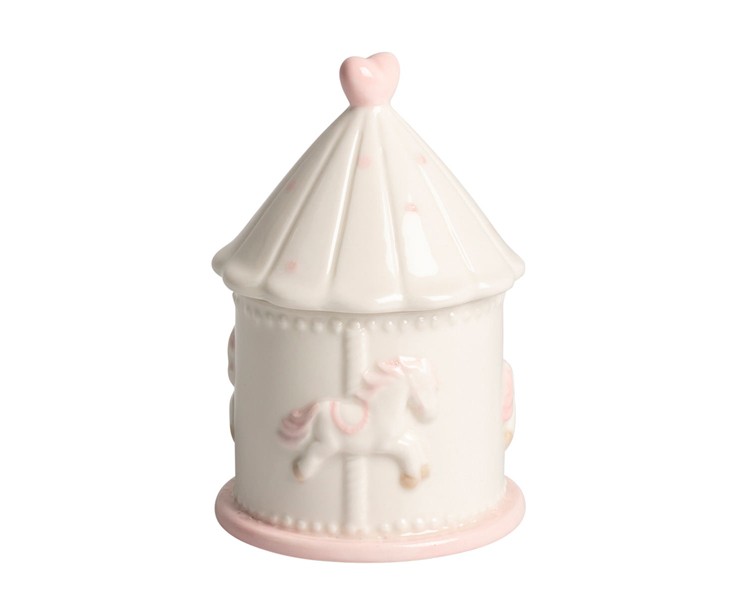 Dolcissima candela profumata racchiusa in un'elegante giostrina in porcellana decorata con cavallini in rilievo e dettagli in rosa. Perfetta come bomboniera per nascita o battesimo, questa candela unisce stile e tenerezza, rendendo speciale ogni ambiente.