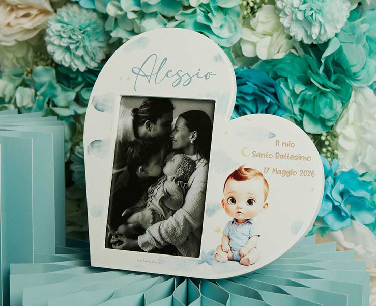 Bomboniera Claraluna Portafoto Cuore Battesimo Maschio Personalizzabile