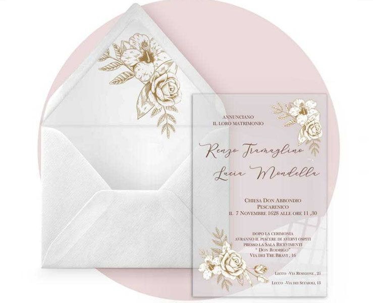 Partecipazione di nozze in plexiglass trasparente rettangolare con rose color oro
