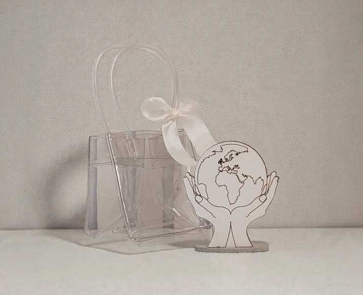 La base ospita un'elegante sagoma in legno intagliata al laser che rappresenta due mani aperte verso il futuro, intente a custodire e proteggere il mondo intero. È il dono perfetto per simboleggiare l'inizio di un nuovo cammino o il raggiungimento di un traguardo importante in cui "il mondo è nelle tue mani".