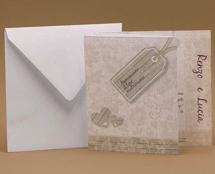 Partecipazioni di nozze 15x15 cm chiusa a fisarmonica, con disegno di targhetta in legno con parte di annuncio e nomi degli sposi laterali su esterno,invito incluso e iniziali a pop-up, sull'intero fondo della partecipazione, busta a taglio punta