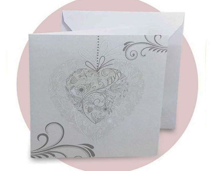 Partecipazione di nozze economica quadrata in carta bianca liscia, formato libro, decoro su fronte stampa cuore stilizzato