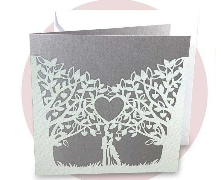 Partecipazione di nozze quadrata con apertura a libro, realizzata su carta bianca liscia con apertua libro, stampa di un fondo rosa antico e sul fronte è presente la stampa di due alberi, i cui rami formano un cuore.