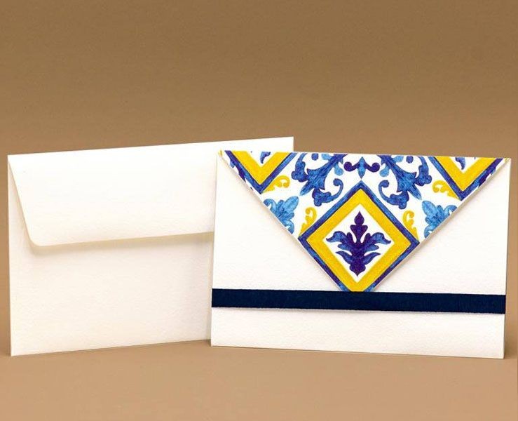 Partecipazione di nozze 12x18 cm composta da un cartoncino esterno in carta martellata panna con stampa maiolica blu e gialla, cartoncino per partecipazione in carta perlata e un nastro in cotone blu che chiude la partecipazione, busta rettangolare con taglio quadro in carta martellata panna.