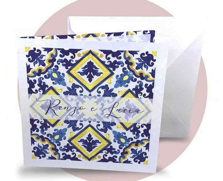 Partecipazione di nozze quadrata con apertura a libro in cartoncino bianco e stampa decori maioliche nei colori del giallo e blu. All'interno della busta è inserita una fodera stampata, personalizzata con lo stesso decoro della partecipazione.