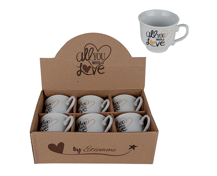 Grafica Iconica: Ogni tazzina è impreziosita dalla scritta "All You Need is Love", realizzata con un mix di font moderni in nero e delicati tocchi color oro/sabbia che formano un cuore stilizzato.