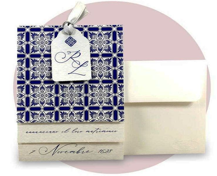 Partecipazione di matrimonio realizzata su carta martellata panna, modello calendario con stampa maioliche nel colore blu,, composto da tre cartoncini legati tra loro da un nastro in raso grigio. Busta e stampa compresa