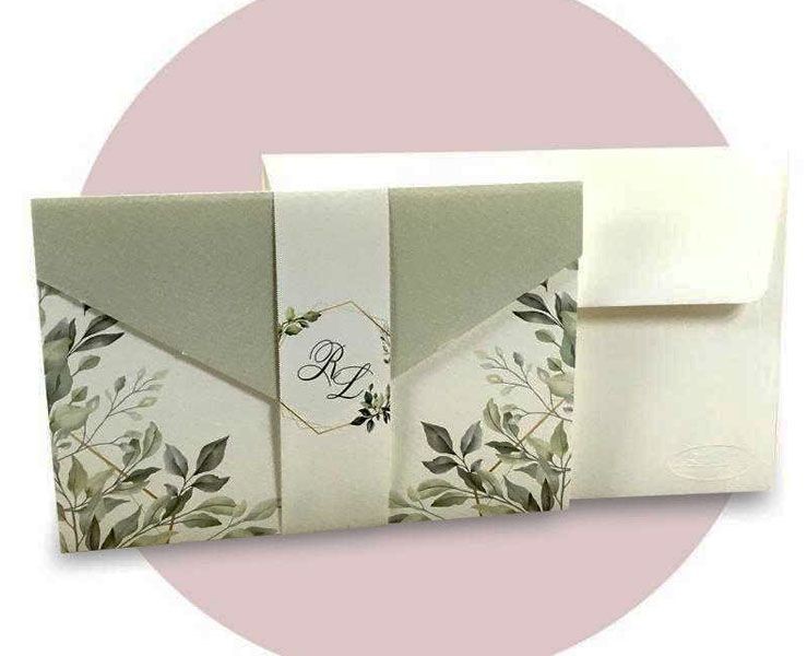 Partecipazione di nozze stile shabby chic con foglie e ulivi, realizzata su carta martellata panna con fascia di chiusura personalizzata con le iniziali degli sposi.