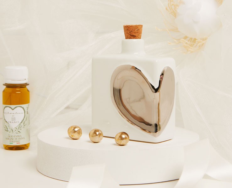 La collezione Claraluna 2025 propone una bomboniera che unisce funzionalità e raffinatezza: l'oliera grande in porcellana, impreziosita da una bottiglietta di olio extra vergine d'oliva da 60 ml. Questo oggetto, dal design romantico e delicato, è perfetto per chi desidera regalare un ricordo utile e di valore durante matrimoni, anniversari o altre ricorrenze speciali