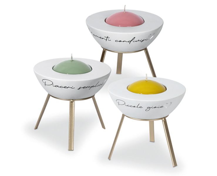 Il portacandela è realizzato in pregiata ceramica bianca opaca, caratterizzato da una forma a ciotola pulita e moderna impreziosita da un piccolo cuore a rilievo. La struttura è completata da uno stand a tre piedi in metallo color oro satinato, che conferisce slancio ed eleganza all'oggetto. Il set è assortito in tre varianti, ognuna decorata con una raffinata scritta in corsivo che celebra la bellezza della vita: