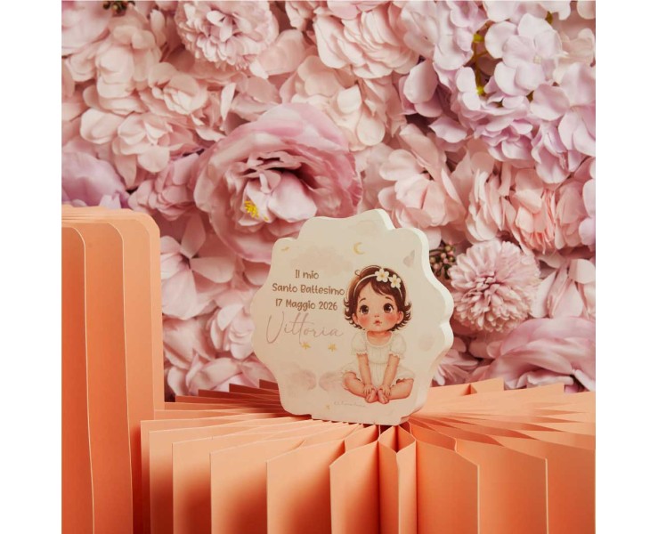 Bomboniera Personalizzata: La placca offre ampio spazio per la personalizzazione con il Nome della bambina, l'Evento (Battesimo, Comunione, ecc.) e la Data, trasformando ogni pezzo in un ricordo unico e indimenticabile (come nell'esempio: Vittoria, Il mio Santo Battesimo, 17 Maggio 2026).