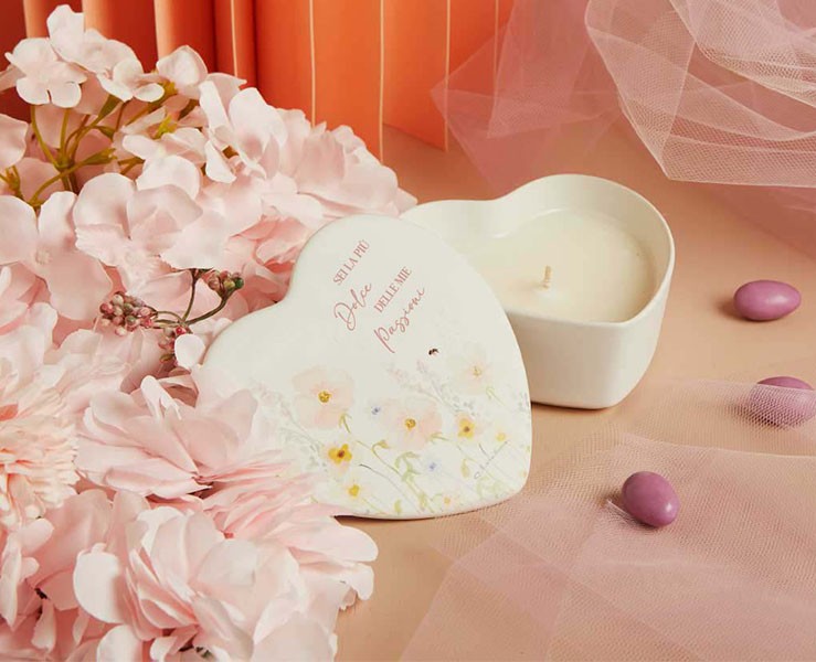 La collezione Claraluna 2026 esprime la purezza dell’amore attraverso questa raffinata scatola a cuore con candela profumata in porcellana bianca, dalle dimensioni di 12x12x4,5 cm, decorata con un delicato motivo floreale rosa e la romantica frase “Sei la più dolce delle mie passioni”.