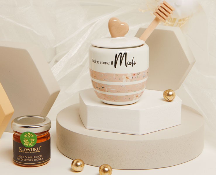 - Design: Elegante decorazione con scritta "Dolce come il miele" e cuore rosa
